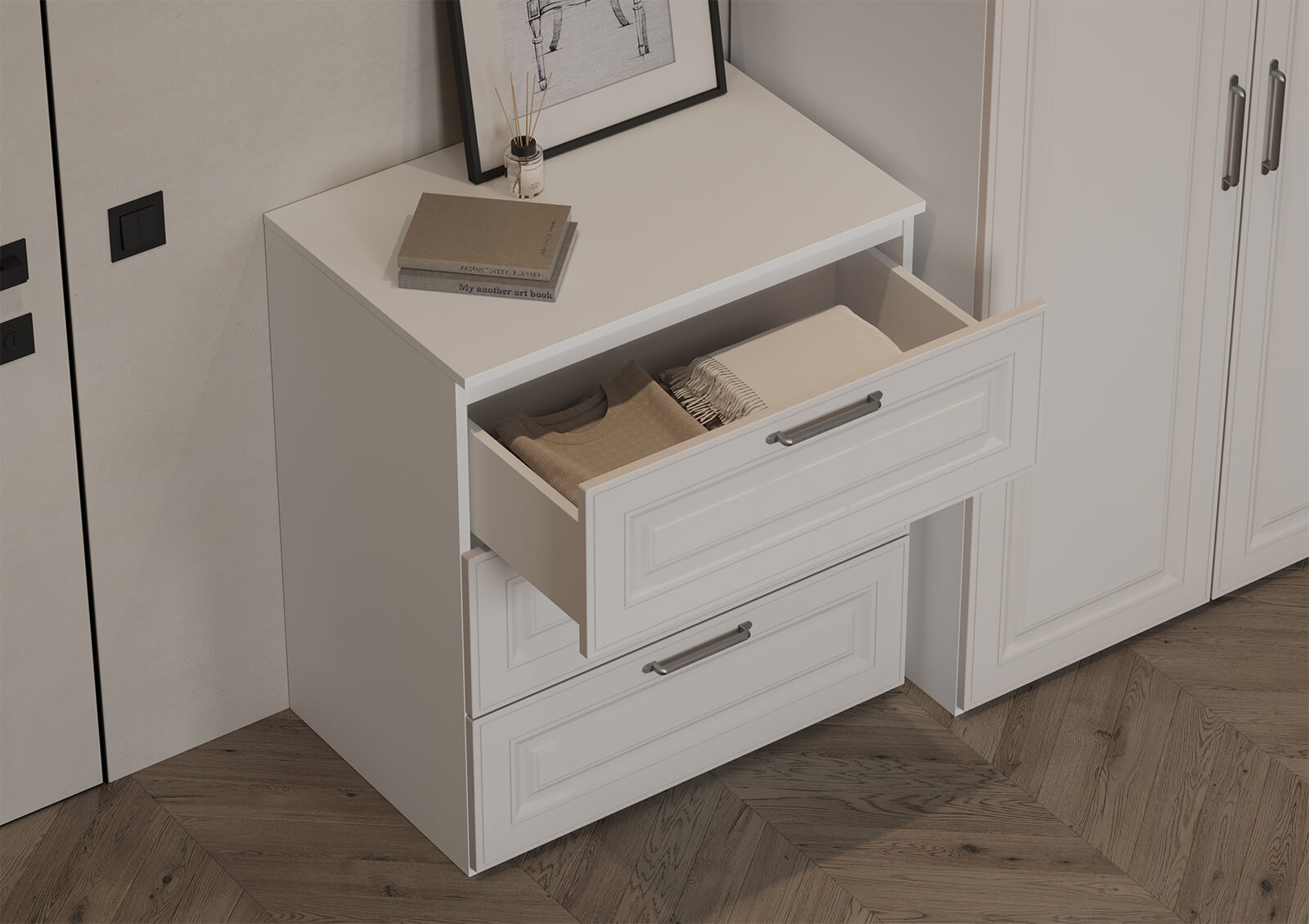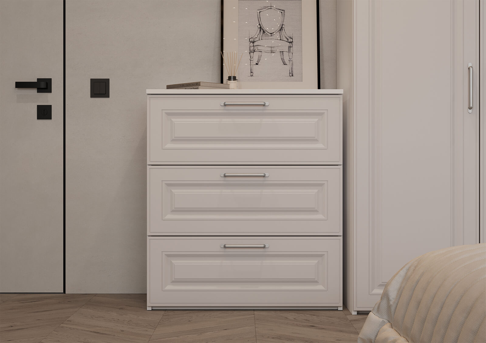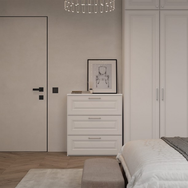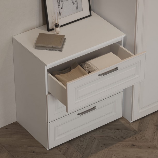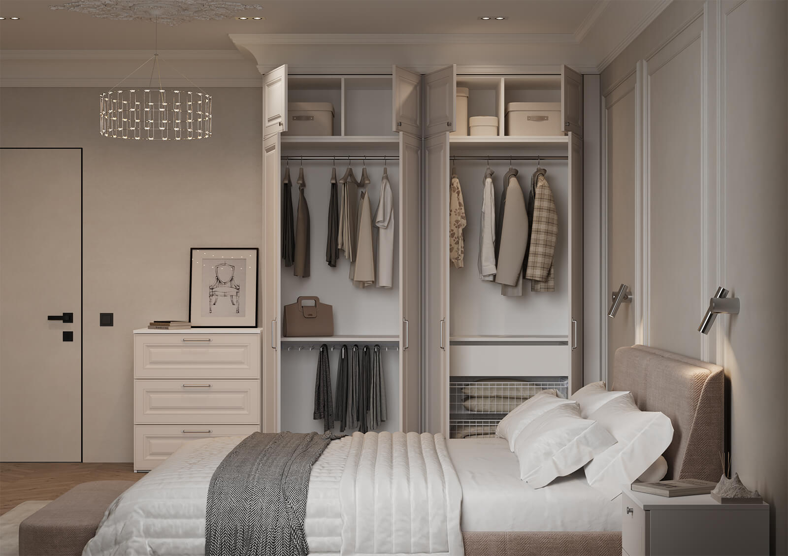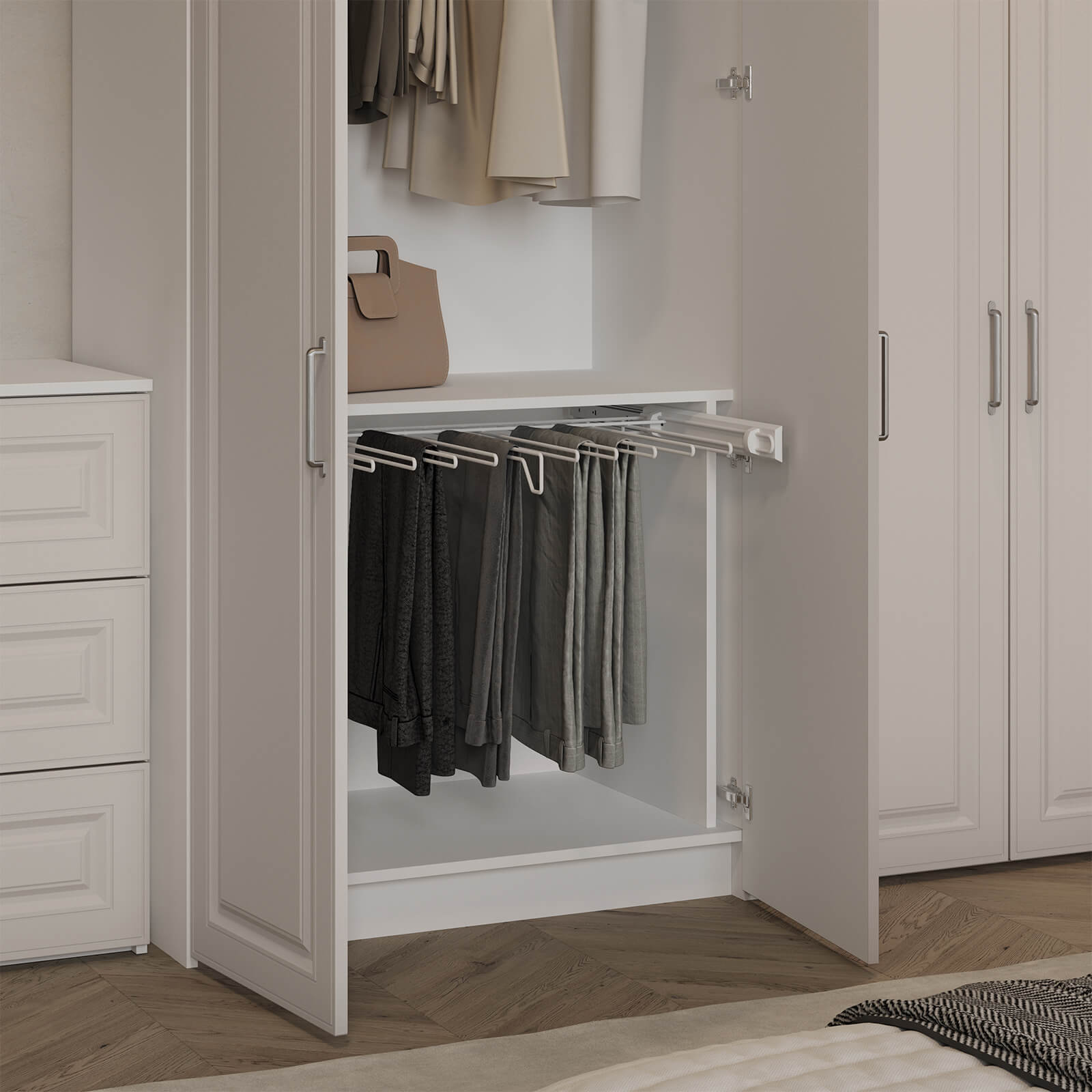 Штанга для одежды Ø25 мм (цвет Хром), выдвижная корзина для белья (цвет Белый), выдвижная вешалка для брюк (цвет Белый)