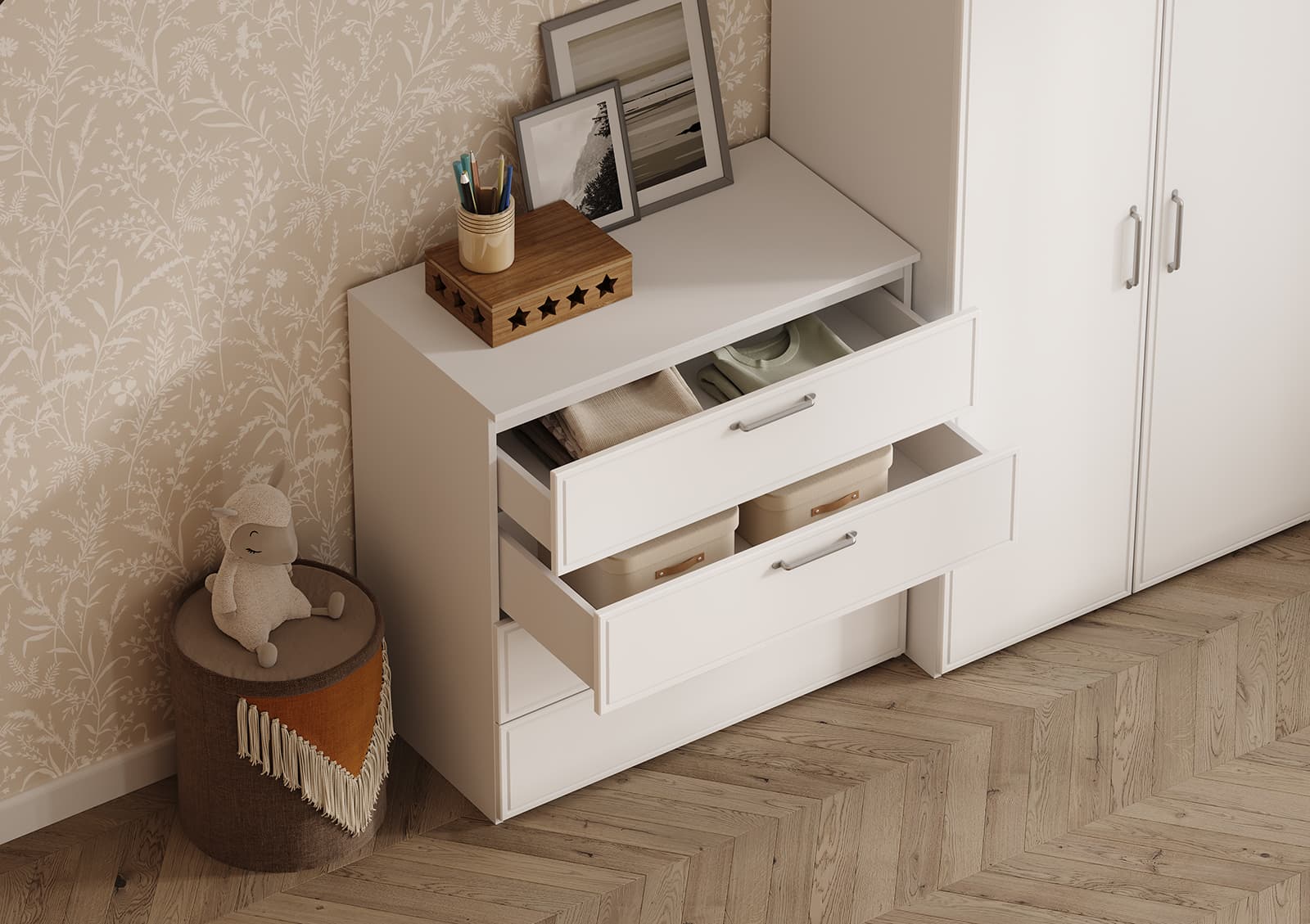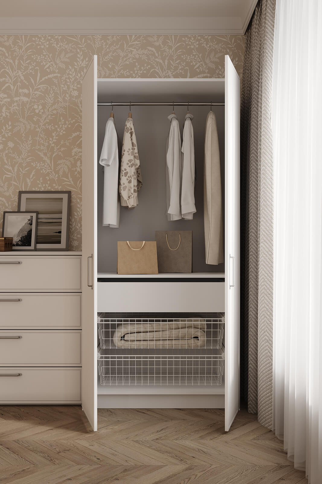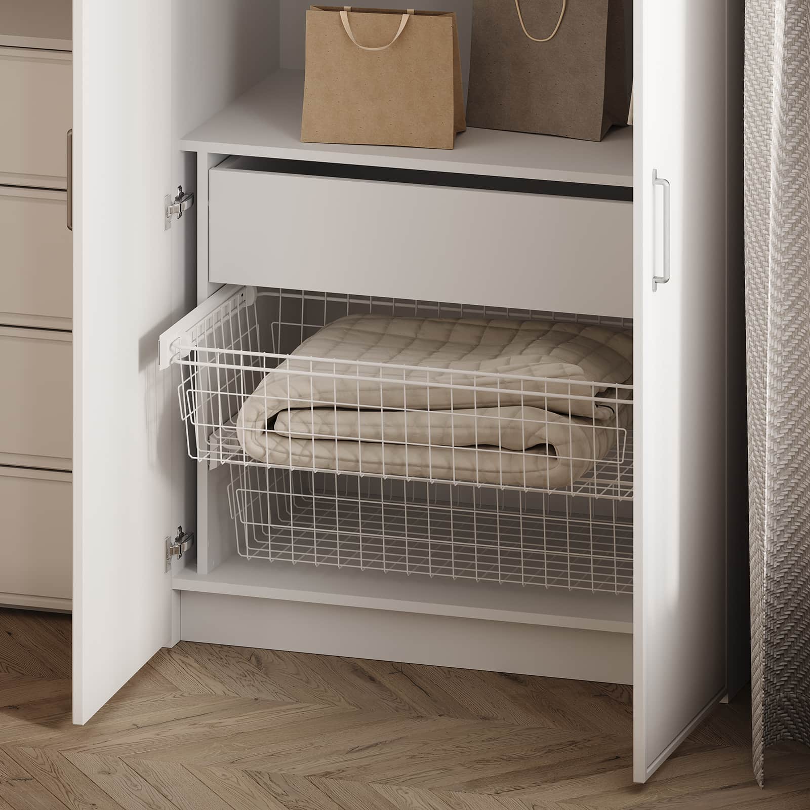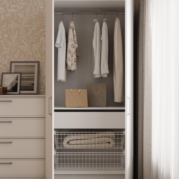 Штанга для одежды Ø25 мм (цвет Хром), выдвижная корзина для белья (цвет Белый)