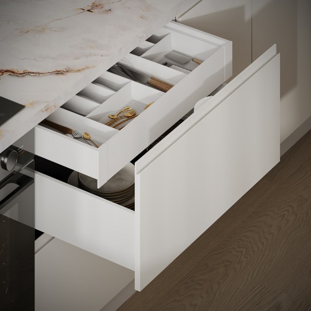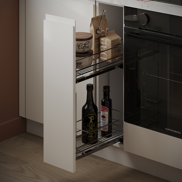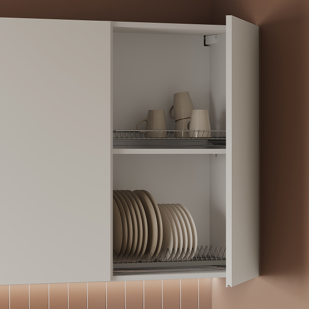 Выдвижная корзина Хром (ширина 200 мм), сушка для посуды в выдвижной ящик (хромированная сталь, ширина 600 мм), лоток для столовых приборов (цвет Белый, ширина 800 мм), профиль LED накладной (цвет Алюминий)