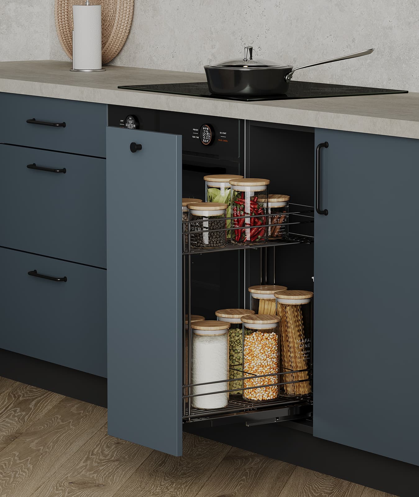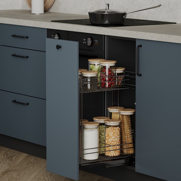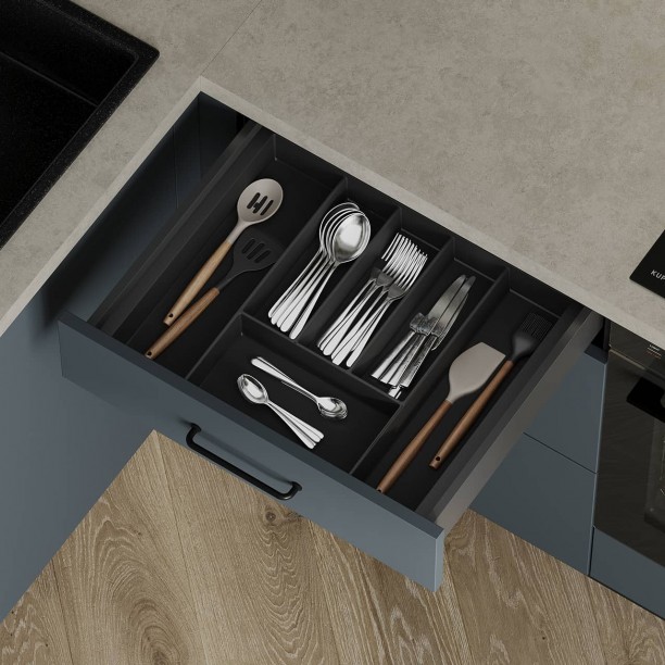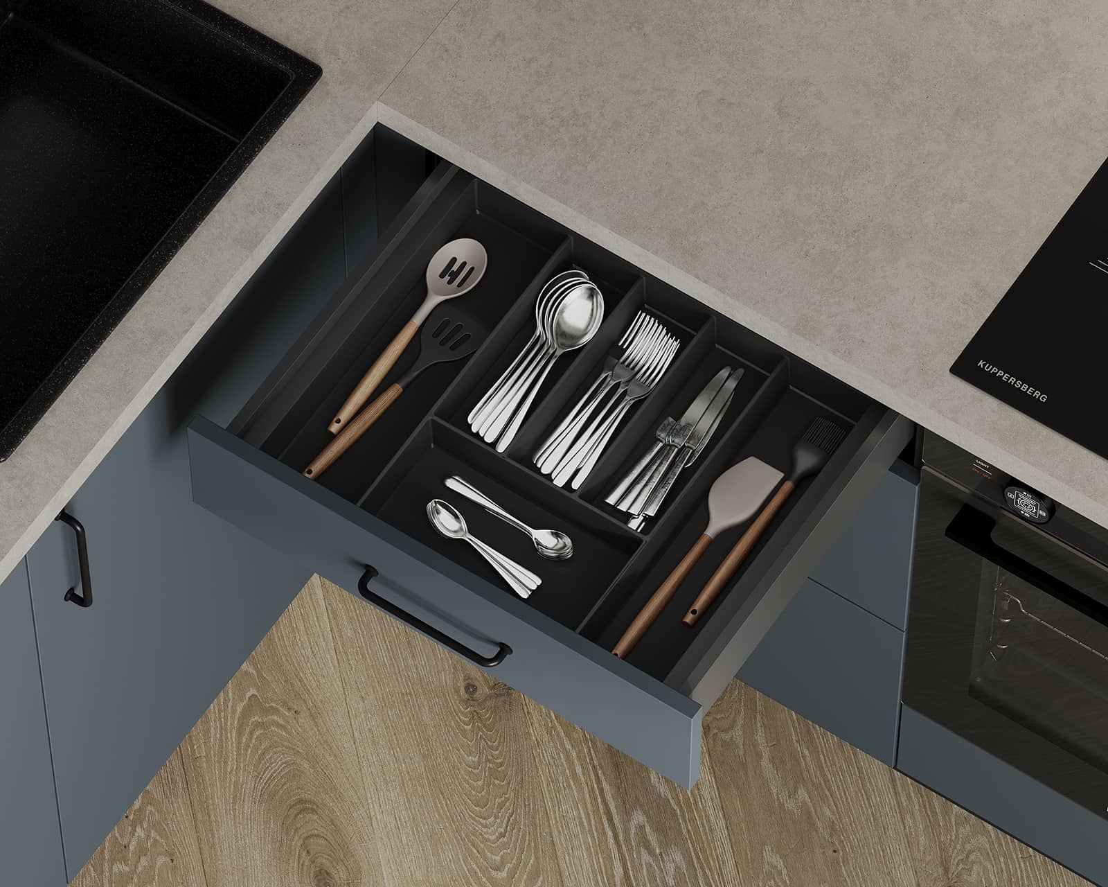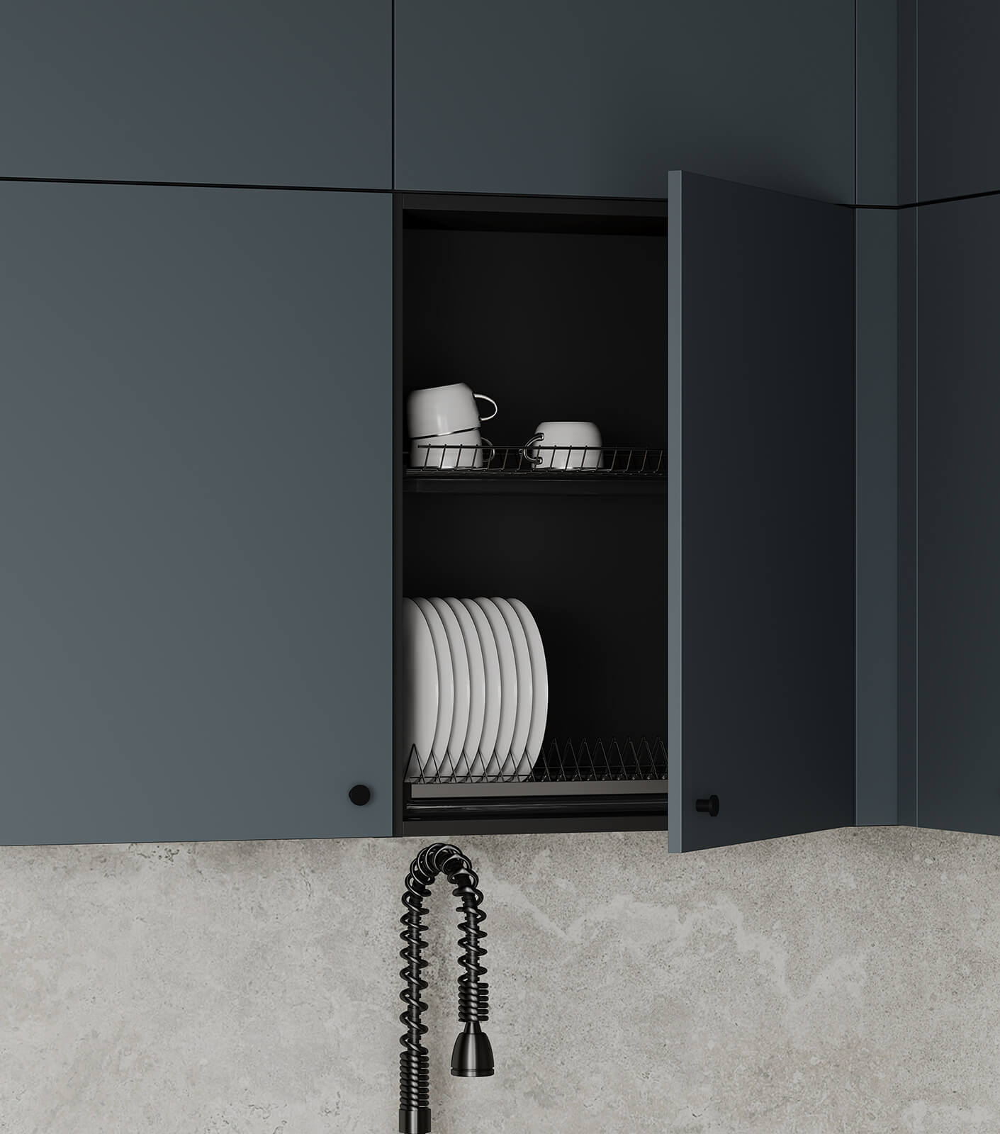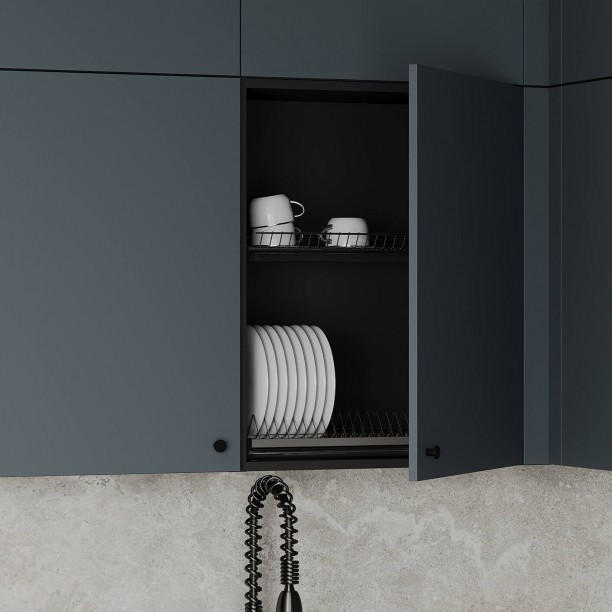 Выдвижная корзина Хром (ширина 300 мм), сушка для посуды в верхний шкаф (2 уровня, хромированная сталь, ширина 600 мм), лоток для столовых приборов (цвет Графит, ширина 600 мм), решетка вентиляционная алюминиевая 60 × 484 мм (цвет Черный)