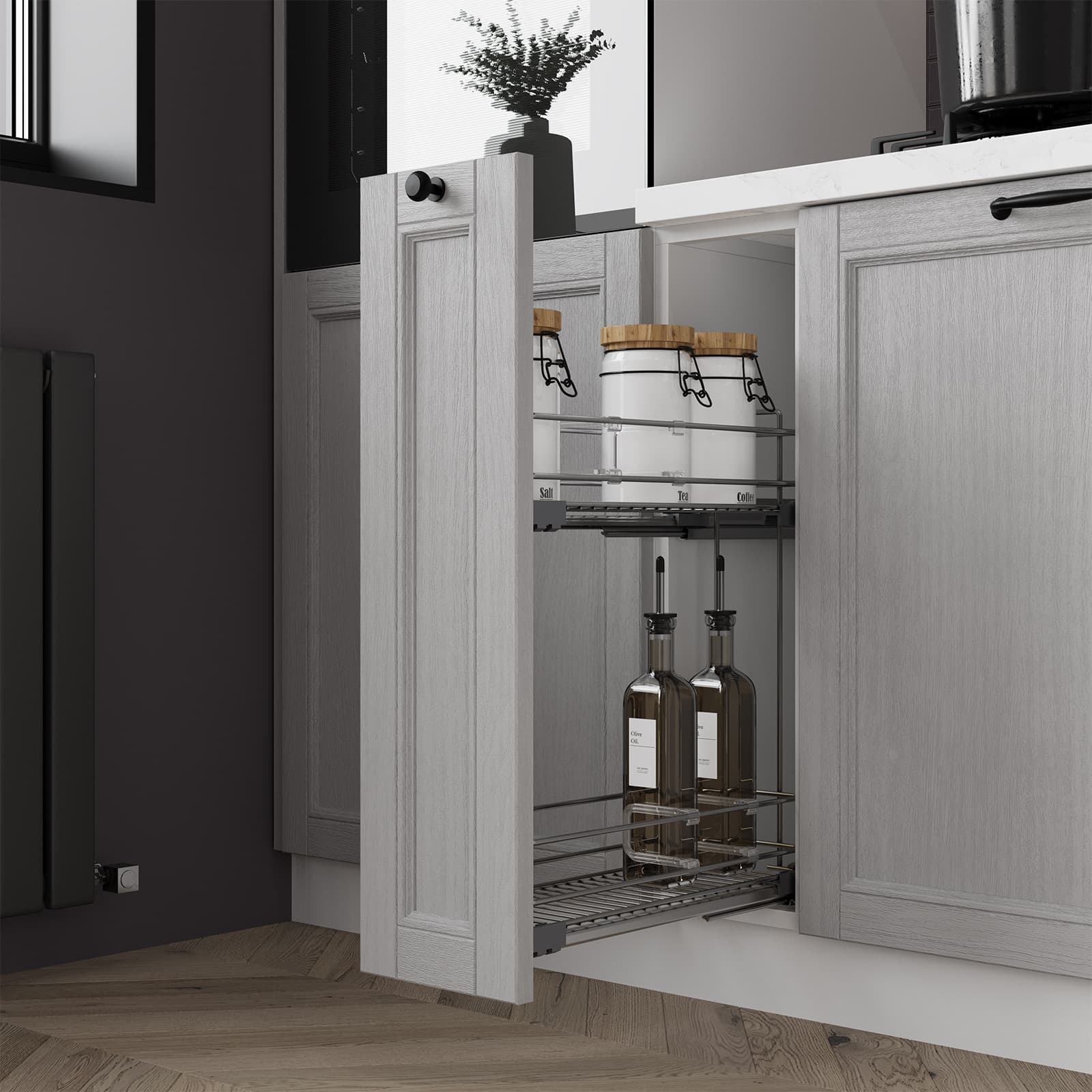 Выдвижная корзина Ларио (ширина 200 мм), сушка для посуды в верхний шкаф (2 уровня, хромированная сталь, ширина 600 мм), лоток для столовых приборов (цвет Белый, ширина 600 мм), решетка вентиляционная алюминиевая 60 × 484 мм (цвет Алюминий), профиль LED накладной (цвет Алюминий)
