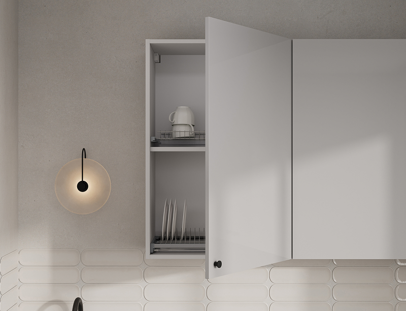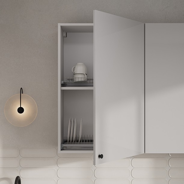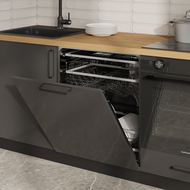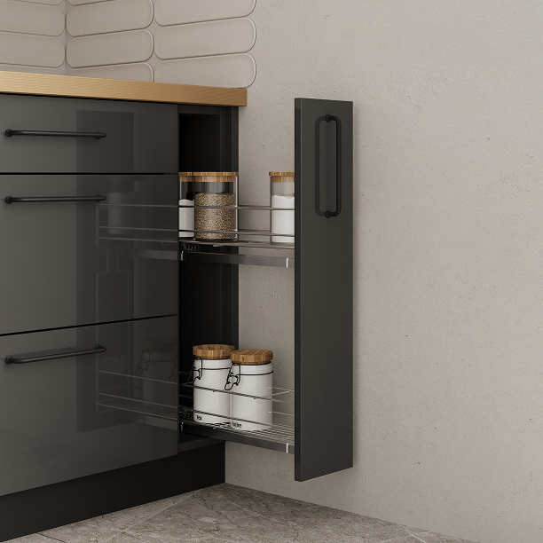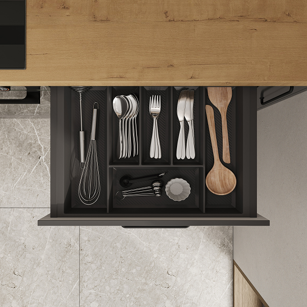 Выдвижная корзина Хром (ширина 150 мм), сушка для посуды в верхний шкаф (2 уровня, хромированная сталь, ширина 600 мм), лоток для столовых приборов (цвет Графит, ширина 600 мм)