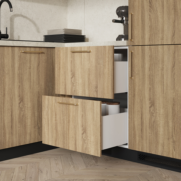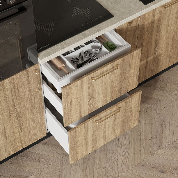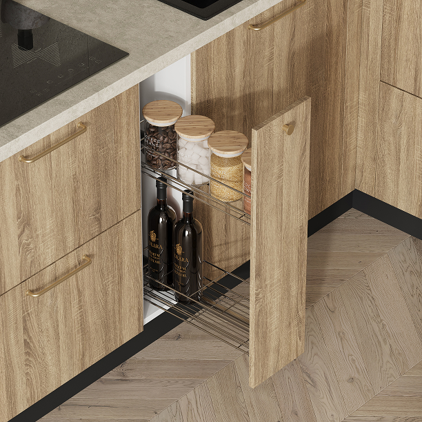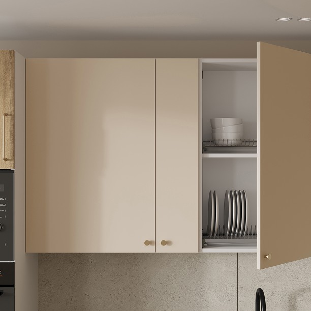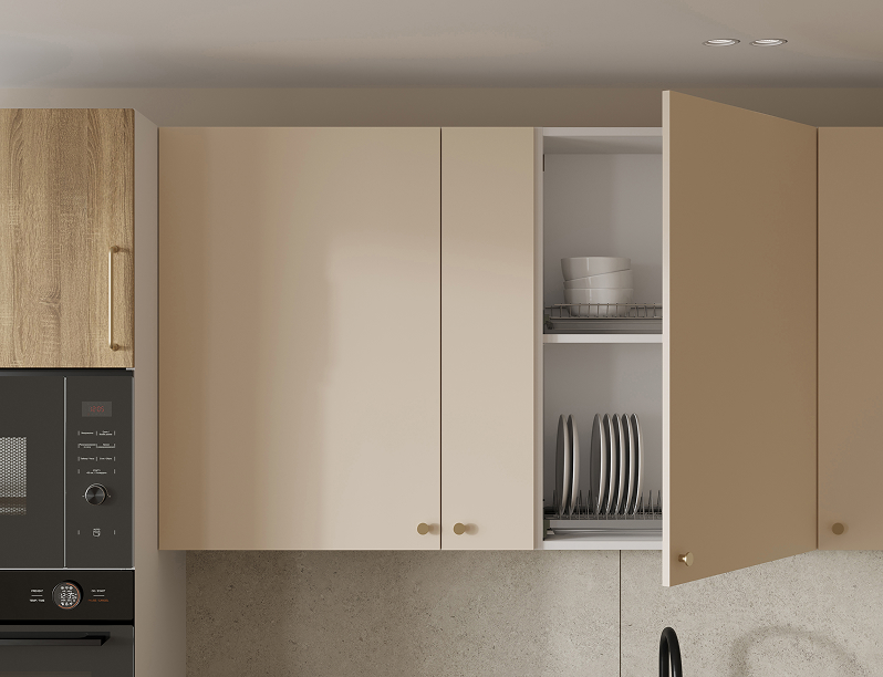 Выдвижная корзина Хром (ширина 200 мм), сушка для посуды в верхний шкаф (2 уровня, хромированная сталь, ширина 600 мм), лоток для столовых приборов (цвет Белый, ширина 600 мм), решетка вентиляционная алюминиевая 60 × 484 мм (цвет Черный)
