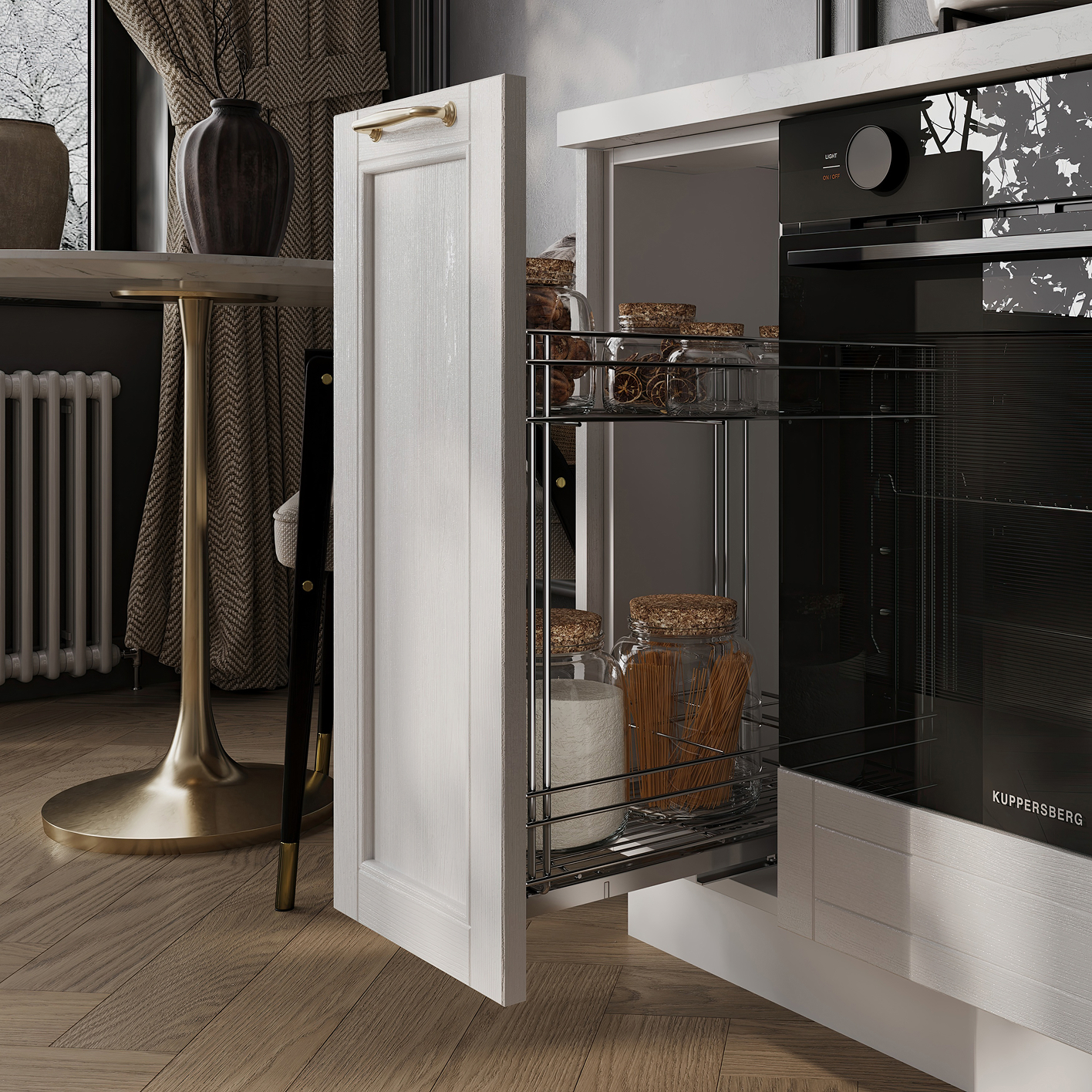Выдвижная корзина Ларио (ширина 300 мм), сушка для посуды в верхний шкаф (2 уровня, хромированная сталь, ширина 900 мм), лоток для столовых приборов (цвет Белый, ширина 500 мм), решетка вентиляционная алюминиевая 60 × 484 мм (цвет Алюминий), профиль LED накладной (цвет Черный)