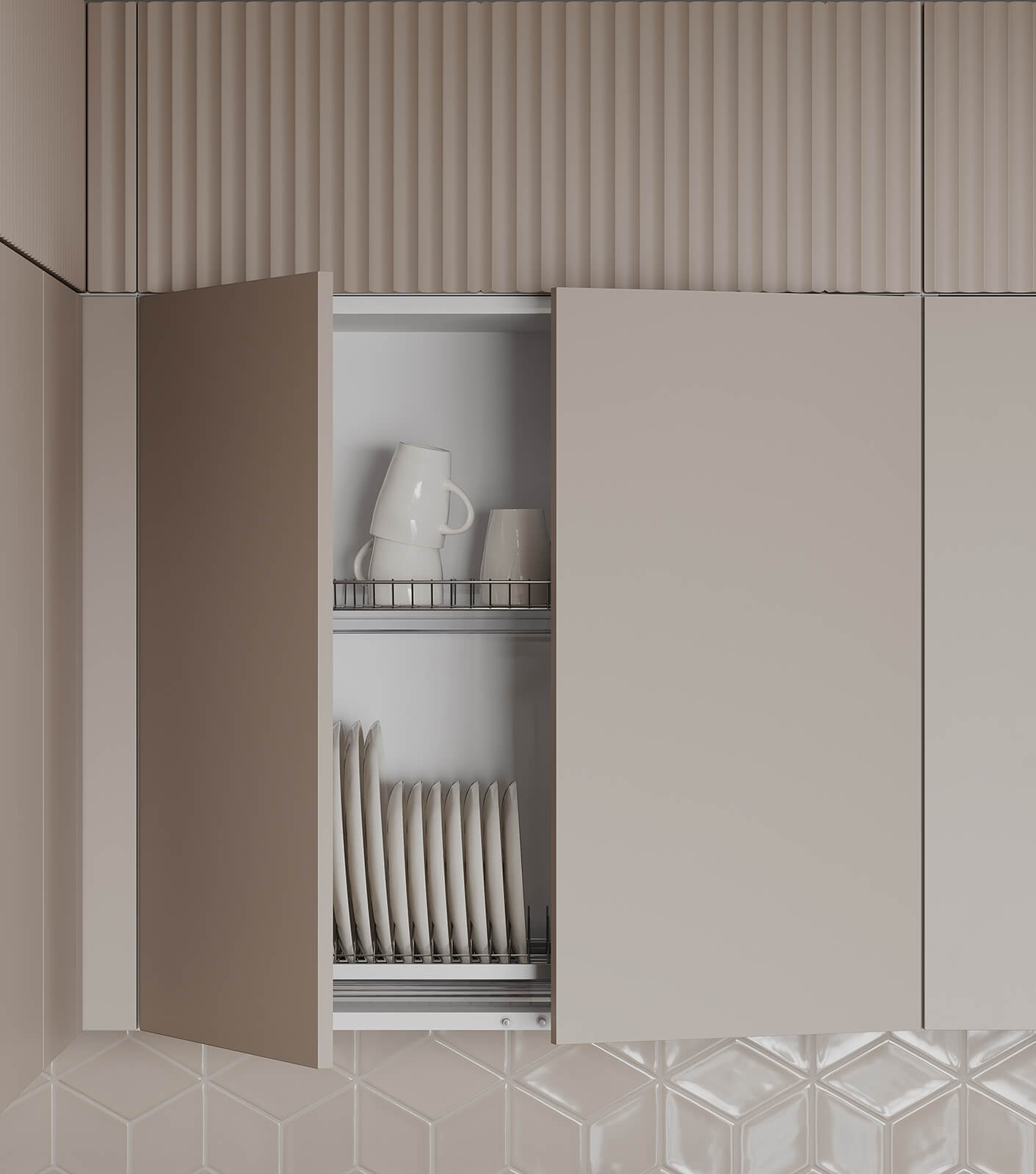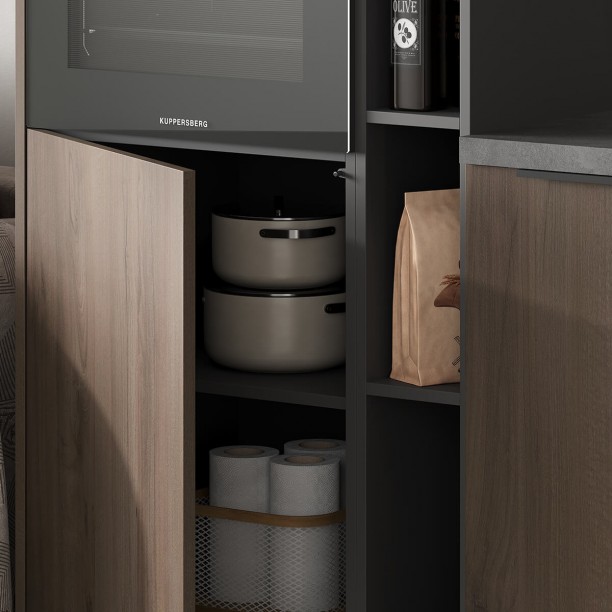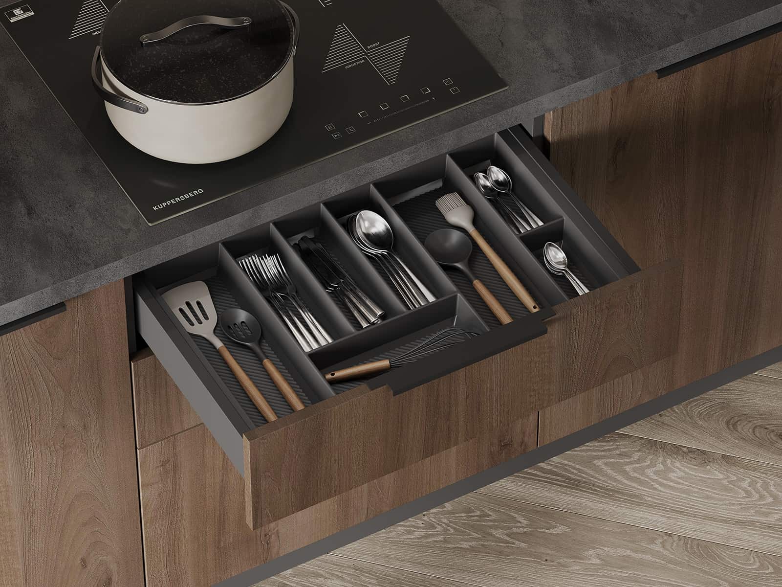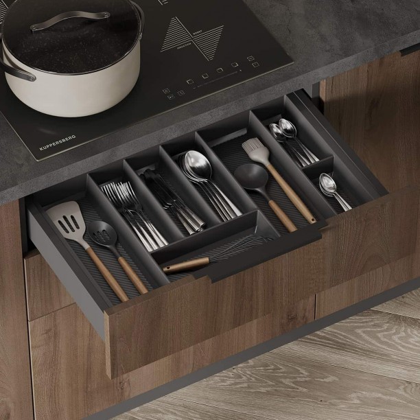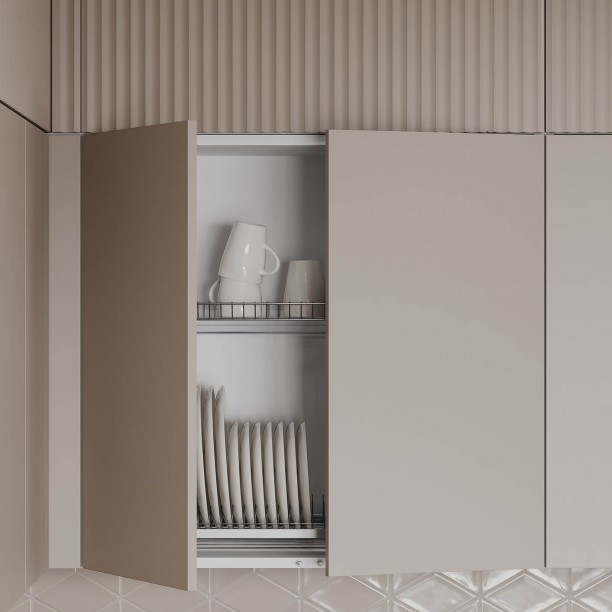 Сушка для посуды в верхний шкаф (2 уровня, хромированная сталь, ширина 800 мм), лоток для столовых приборов (цвет Графит, ширина 700 мм), решетка вентиляционная алюминиевая 60 × 484 мм (цвет Черный), профиль LED накладной (цвет Черный)