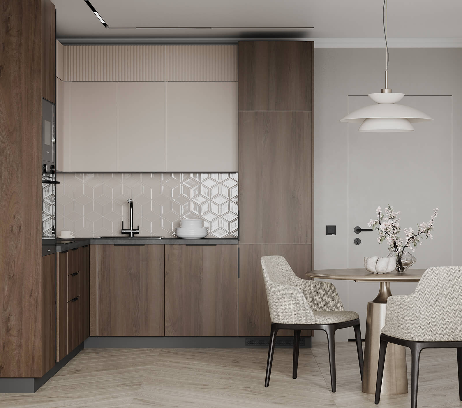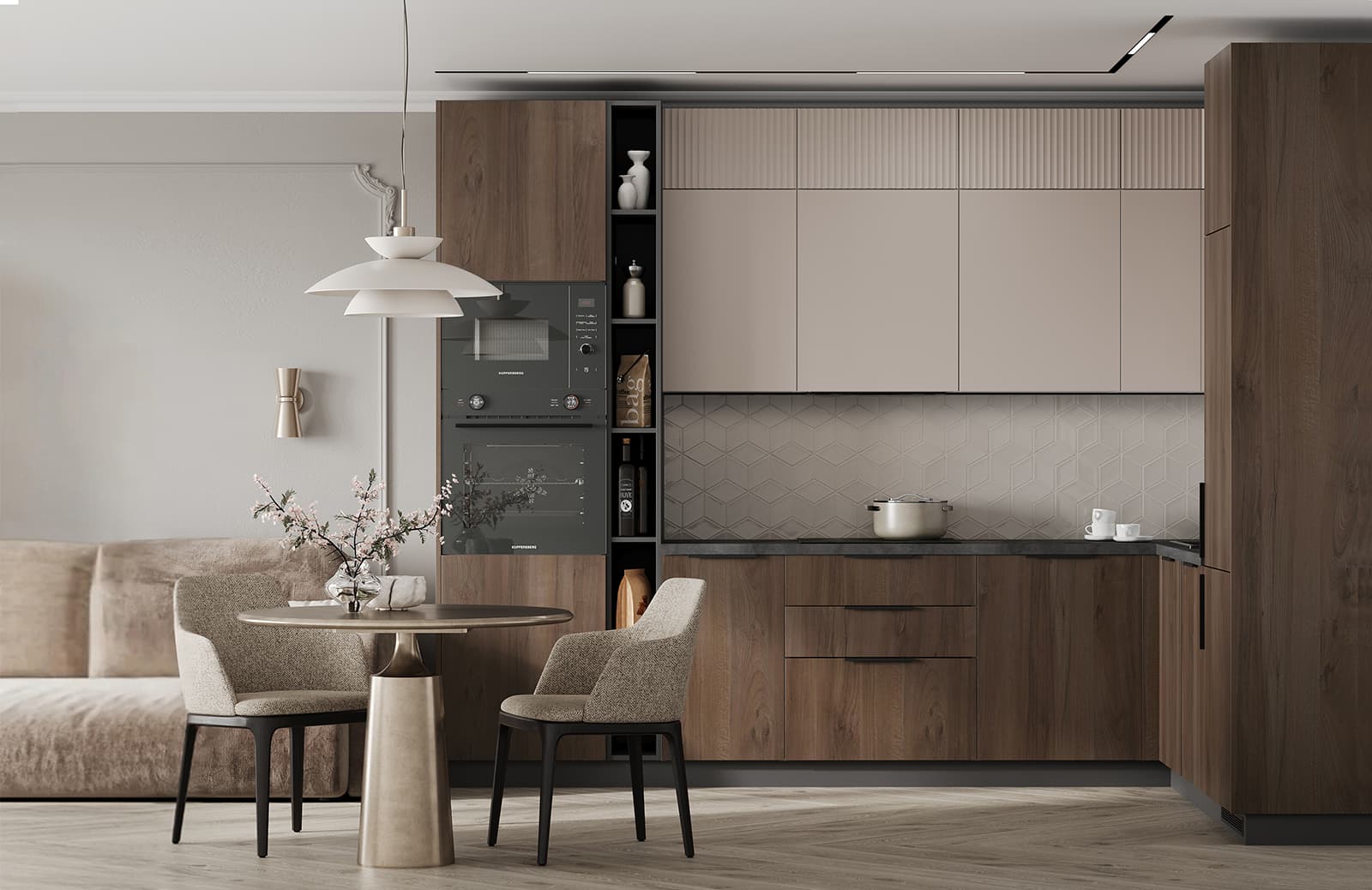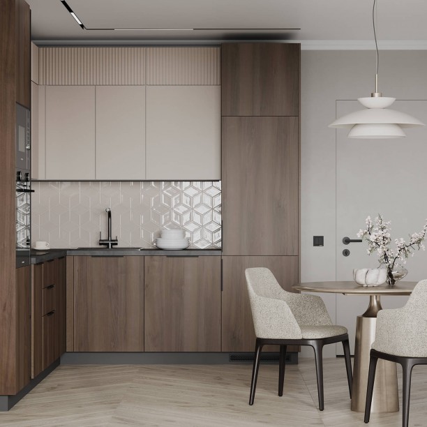 Авис (МДФ/ПВХ), цвет Сатин Песочный Ф Premier Matt / МДФ/ПВХ, цвет Сатин Песочный Ф Premier Matt / ЛДСП 18 мм, декор Орех Пацифик