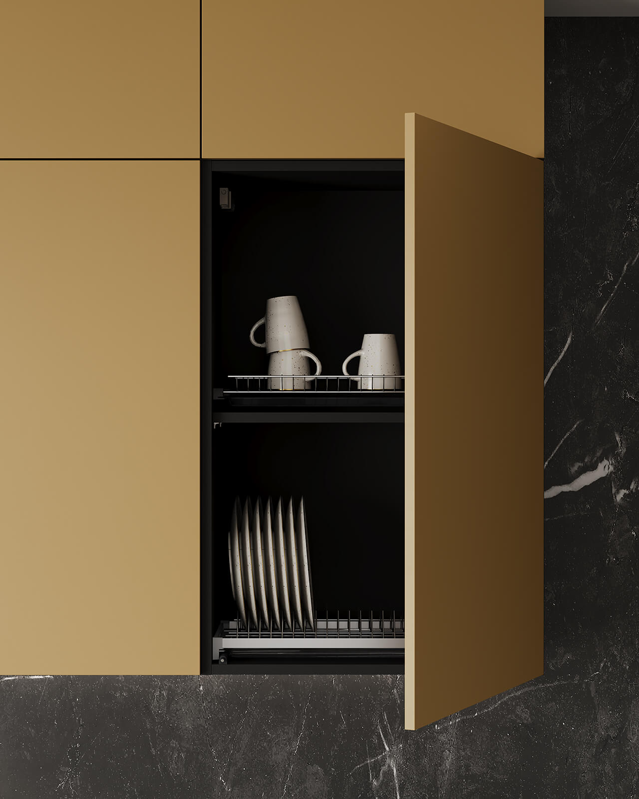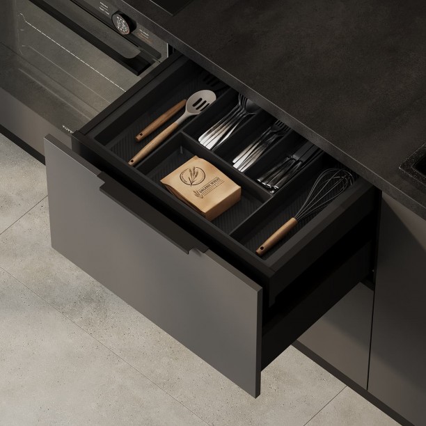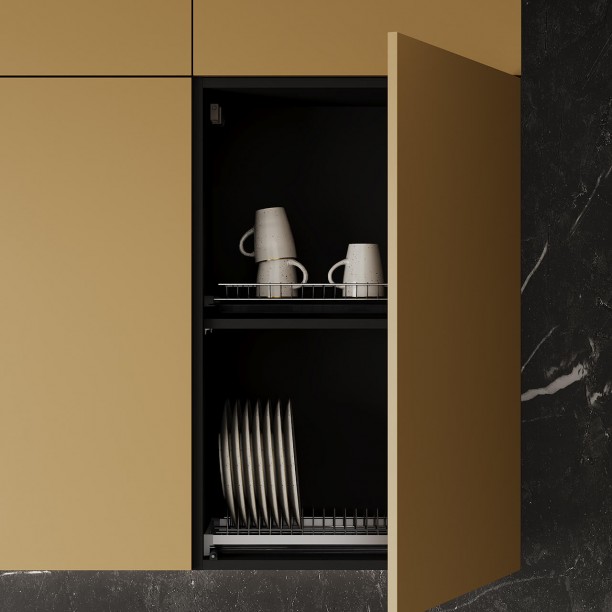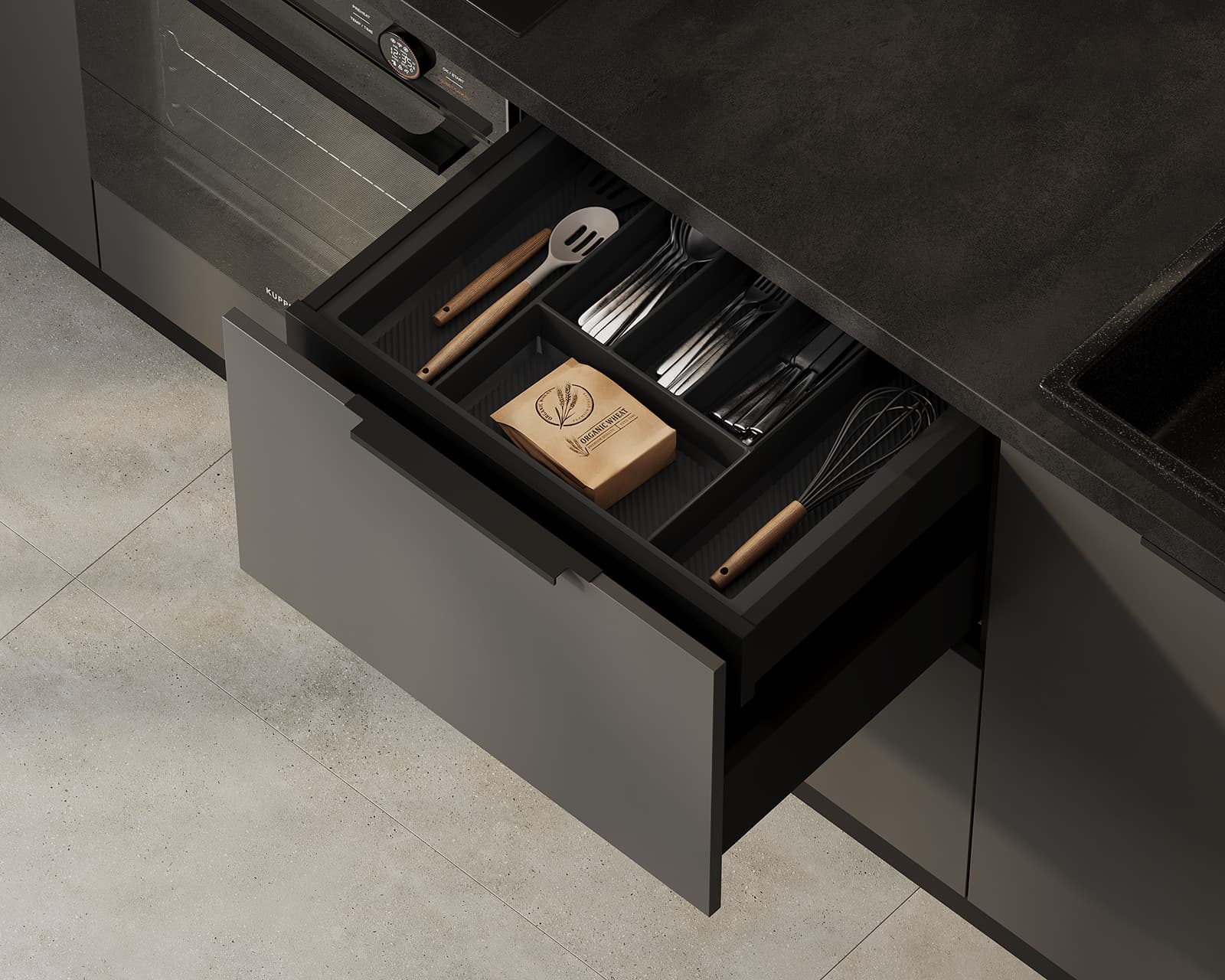 Сушка для посуды в верхний шкаф (2 уровня, хромированная сталь, ширина 600 мм), лоток для столовых приборов (цвет Графит, ширина 600 мм), профиль LED угловой накладной (цвет Чёрный)